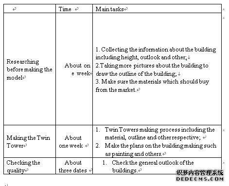 Time management is quite important in the project; timeline of the 3D project would like to perform as follow: the main making could divide into three processes; they are researching before making the model,making the Twin Tower, and checking the quality.